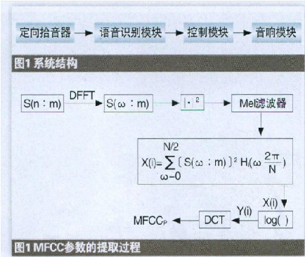 車載語音控制器系統(tǒng)由定向拾音器、語音識別模塊、控制模塊和音響模塊組成。系統(tǒng)的功能是:由拾音器采集駕駛員發(fā)出的語音命令,利用語音識別模塊將拾音器輸出的語音物理聲音信號轉變成語音數字信號,并識別出語音命令對應的漢字或詞語,之后由控制模塊產生與之對應的詞條編碼指令,通過系統(tǒng)I/O口線將控制命令傳達給音響,車載音響接收到控制指令產生動作,響應駕駛員的語音命令,比如快進、快退或音量調節(jié)等。系統(tǒng)結構及原理框圖如圖1 所示: