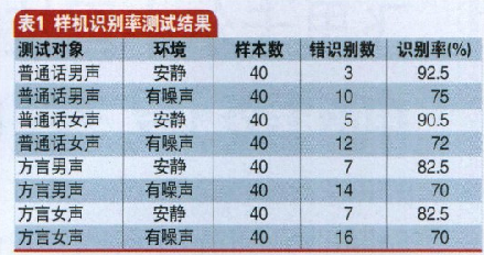 由表1可知,系統(tǒng)的識別率與語音指令詞條字數、麥克接收距離、說話人方言及環(huán)境有關。4字詞識別率高于2字詞,相對安靜環(huán)境下識別率可以達到90%以上,男聲和女聲的識別率接近。有噪聲干擾環(huán)境中識別率下降。為了提高系統(tǒng)的識別率,系統(tǒng)樣機采用奧林巴斯 ME52定向麥克(在表中沒有反映),提高了麥克接收范圍,使系統(tǒng)總體的識別率上升到95%.