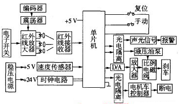 紅外線發(fā)射單元包括編碼調(diào)制器、載波振蕩器、電子開關(guān)、發(fā)射管、聚光透鏡等組成;紅外接收單元為紅外集成一體化接收頭;主控制單元由單片機(jī)、時(shí)鐘電路、復(fù)位電路、手動(dòng)操作鍵盤、D/A轉(zhuǎn)換器組成;執(zhí)行單元由光電隔離器、模擬放大器組成;聲光報(bào)警單元由電機(jī)車電笛和閃光報(bào)警電路構(gòu)成;液壓制動(dòng)單元由速度傳感器、液壓油泵、比例電磁閥、溢流閥、液壓油缸、剎車推桿等組成?! ?br />