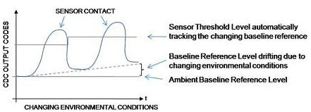 保持可靠性能。容性傳感器電極是采用PCB上的標(biāo)準(zhǔn)銅材料或柔性材料制成的。這種材料的特性會(huì)隨溫度和濕度的變化而發(fā)生改變。這種變化會(huì)使基線電平發(fā)生偏移(所有傳感器閾值電平均是以基線電平為參考的)。較大的基線偏移增加了接觸閾值電平過(guò)低或過(guò)高的風(fēng)險(xiǎn)(過(guò)低還是過(guò)高取決于基線偏移的方向)這會(huì)引起虛假的接觸誤差,或使閾值電平不是太靈敏就是不夠靈敏,導(dǎo)致接觸狀態(tài)的不穩(wěn)定。為保持傳感器原始的信號(hào)接觸閾值檢測(cè)電平余量(靈敏度),CDC需要自動(dòng)跟蹤基線偏移誤差的幅度,并對(duì)閾值設(shè)置進(jìn)行相應(yīng)的重新調(diào)整。圖2中的示例介紹了AD7147和AD7148的閾值電平如何針對(duì)因環(huán)境條件變化引起的基線失調(diào)變化進(jìn)行自動(dòng)跟蹤和調(diào)整。