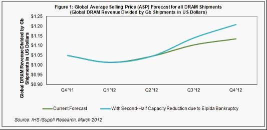 如果爾必達的產(chǎn)能減少逾25%,則到2012年底,所有DRAM出貨量的全球平均銷售價格(ASP)預計上升到1.21美元,比上半年末的1.05美元上漲15.5%,如圖1所示。如果不是破產(chǎn)導致產(chǎn)能大減,今年底價格將上升到1.13美元,只比上半年末的水平高出8.5%。