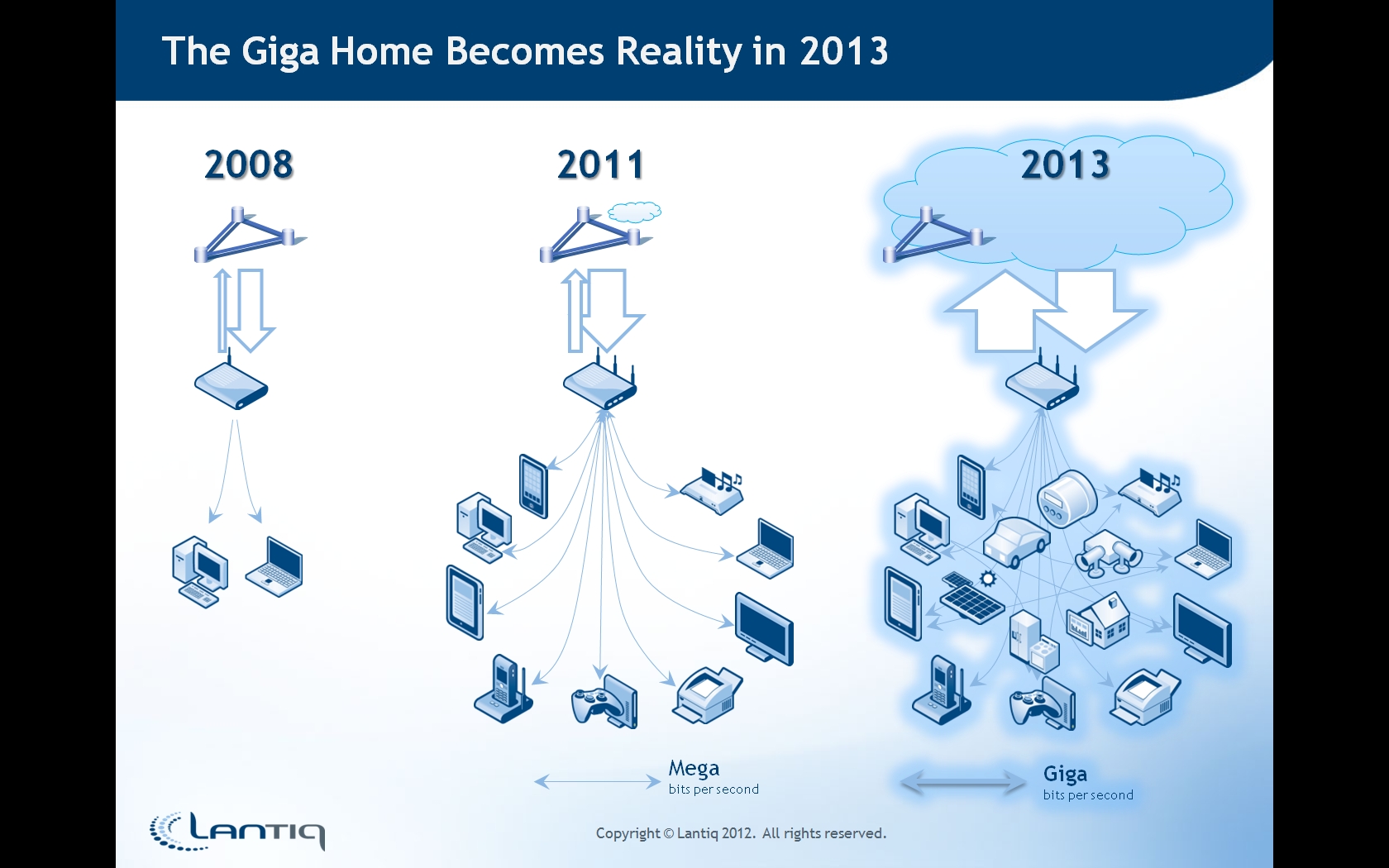 在家庭之中,對帶寬的需求持續(xù)不斷地增長。平板電腦、智能手機、PC、網(wǎng)絡存儲設備(NAS)、電視和游戲機都需要可靠且快速的高數(shù)據(jù)流量。所有的這些設備都相互連接并聯(lián)到互聯(lián)網(wǎng)中,當添加了云計算和HDTV/IPTV流媒體服務時,寬帶網(wǎng)絡中的數(shù)據(jù)需求將爆發(fā)。