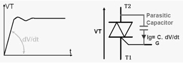 電壓上升率的抵制:dv/dt指的是在關(guān)斷狀態(tài)下電壓的上升斜率,這是防止誤觸發(fā)的一個(gè)關(guān)鍵參數(shù)。此值超限將可能導(dǎo)致可控硅出現(xiàn)誤導(dǎo)通的現(xiàn)象。由于可控硅的制造工藝決定了A2與G之間會存在寄生電容,如圖2所示。我們知道dv/dt的變化在電容的兩端會出現(xiàn)等效電流,這個(gè)電流就會成為Ig,也就是出現(xiàn)了觸發(fā)電流,導(dǎo)致誤觸發(fā)。