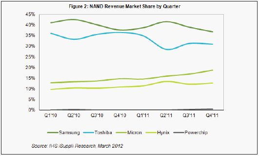 在材料方面,晶圓供應商在一個月后就快速恢復了生產,并提高了其它地點的產量,使其主要客戶面臨的供應短缺問題降低最小。中期來看,這場災害實際上導致NAND市場更加接近供需平衡,幫助該產業(yè)的營業(yè)收入在2011年第三季度環(huán)比增長10.0%,而2010年第三季度是環(huán)比增長9.1%。
