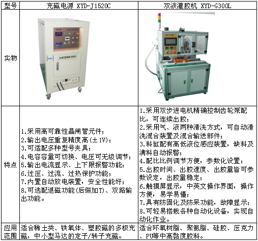 深圳市欣音達(dá)科技有限公司是一家專業(yè)研發(fā)生產(chǎn)流體控制系統(tǒng)及磁性應(yīng)用系統(tǒng)的制造企業(yè),下轄有灌膠機(jī)事業(yè)部、點(diǎn)膠機(jī)事業(yè)部及充退磁機(jī)事業(yè)部,客戶來自全球各地。中國電子展期間,欣音達(dá)科技給我們帶來了兩款先進(jìn)的產(chǎn)品,其特點(diǎn)如下表所示: