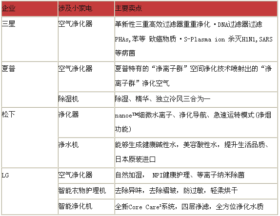除LG外,松下、夏普、三星等外資企業(yè)均在持續(xù)推出小家電產(chǎn)品,主要涉及空氣凈化器和凈水機(jī)兩大產(chǎn)品線,其中空氣凈化器是涉足比較多的一類產(chǎn)品。
