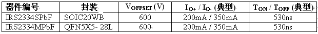IRS2334SPbF 采用 SOIC20WB 封裝,而 IRS2334MPbF 則以 QFN5X5 封裝供貨,占位面積只有25 mm2 ,并按照合適的爬電與間隙距離要求來設(shè)計(jì),確保產(chǎn)品堅(jiān)固可靠,電壓可高達(dá)600V。
