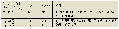 MOSFET的資料中,漏極電流ID及允許耗散功率PD值在不同條件下是不同的,其數(shù)值相差很大。例如,N溝道功率MOSFET IRF6617的極限參數(shù)如表1所示。