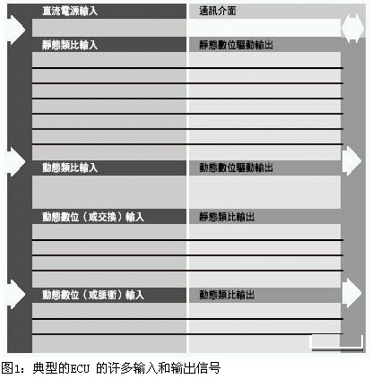 ECU 利用許多信號來監(jiān)控汽車及其環(huán)境,進而管理與控制引擎和輔助設(shè)備,以達到最佳的運作狀態(tài)。圖1摘要了典型的ECU 的許多輸入和輸出信號?! ?br />