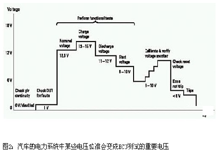 依汽車的操作狀態(tài)而定,在汽車的電力系統(tǒng)中常會碰到某些電壓位準。這些位準會變成ECU測試的重要電壓,如圖2所示。在這些重要電壓下執(zhí)行的一些相關(guān)測試包括: