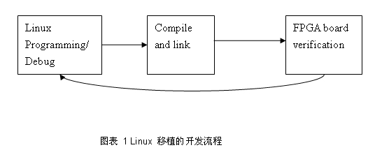 使用者開始進行Linux移植到晶心平臺,首先須先選定一版晶心的Linux原始碼作為基準再進行軟件移植,修改原始碼以符合使用者的開發(fā)平臺,經(jīng)由工具鏈的compile與link所產(chǎn)生的Linux的映像文件,再放到FPGA板上以驗證程序編寫的正確與否,依此開發(fā)程序:軟件編寫->FPGA板驗證,再回到軟件編寫程序直到所有周邊IP在FPGA板上驗證完全,Linux 移植才完成,如圖表 1所示,Linux移植過程中,AICE調(diào)試可以有效加快Linux移植的速度。