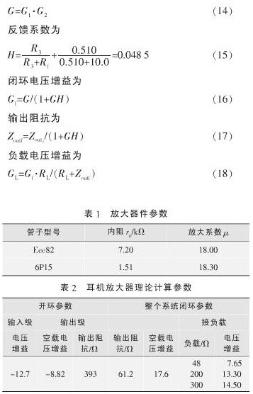輸入級放大器件選用Ecc82雙三極管,輸出級選用6P15,基本參數(shù)如表1所示。為降低輸出阻抗,以便于和阻抗較低的耳機(jī)相匹配,輸出級SRPP電路采用雙管并聯(lián)的方式工作。放大器的相關(guān)參數(shù)計(jì)算方法如下所示,其中開環(huán)電壓增益為: