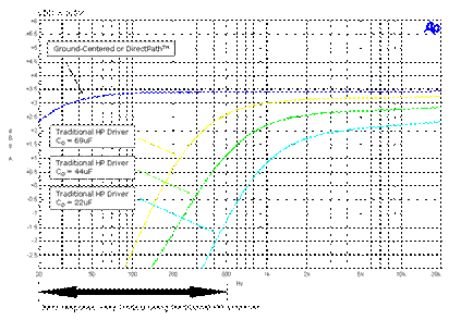對于 100Hz 的截止頻率及 16Ω 的耳機(jī)喇叭阻抗,電容必須是 110μF。對于需要小體積尺寸的情況而言,這會造成電容值及實體尺寸過大,而且使得成本過高。許多工程人員只能改用 22μF 的較小電容,不過這會影響耳機(jī)的低頻率傳真度,而導(dǎo)致低音響應(yīng)不佳。