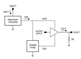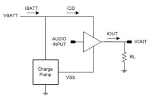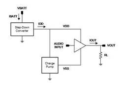 其中的技巧是設(shè)計將電池電壓降低至較低電壓的放大器,并使用適應(yīng)性電源軌 (分別有負(fù)電源軌) 降低播放音樂時整個輸出 FET 的電壓降幅。其中一種實現(xiàn)這類放大器的方式是,使用電荷泵作為圖 8 所示的步降區(qū)塊。某些工程人員偏好這類做法,原因在于步降電荷泵僅需要相對較小的飛馳電容(flying capacitor) (1μF 至 2.2μF),而這也是相對較小的組件