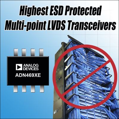 Analog Devices, Inc. (NASDAQ:ADI),全球領(lǐng)先的高性能信號處理解決方案供應商,最近推出一系列多點、低電壓、差分信號(M-LVDS)收發(fā)器ADN469xE,具有所有多點LVDS收發(fā)器中最高的ESD(靜電放電)保護。 ADN469xE M-LVDS系列包含八款收發(fā)器,每款器件都能夠利用一條差分電纜對連接32個數(shù)據(jù)/時鐘節(jié)點并以100 Mbps或200 Mbps的數(shù)據(jù)速率工作。與之相比,傳統(tǒng)的LVDS通信鏈路必須使用32個單獨的點對點節(jié)點,這會顯著增加功耗、連接器尺寸、線纜成本和總電路板空間。ADI公司的ADN469xE M-LVDS系列可提供8 kV IEC ESD保護,是M-LVDS收發(fā)器競爭產(chǎn)品的11倍。這種更高層次的保護能夠提高可插拔板和卡的可靠性,適合無線基站和網(wǎng)絡基礎(chǔ)設施、數(shù)據(jù)采集、自動測試設備以及其他高速、高度網(wǎng)絡化背板和電纜應用。