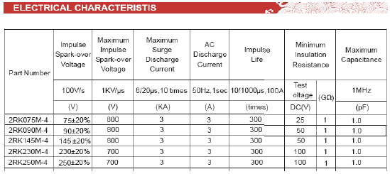 DC spark-over voltage : 定義為以 100V/S 或1000V/S 的上升電壓所測(cè)試出來的擊穿電壓叫直流擊穿電壓,一般符合于標(biāo)稱直流擊電壓的±20%范圍之間;