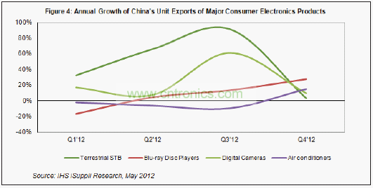 據(jù)IHS iSuppli公司的中國(guó)研究服務(wù),2012年第一季度中國(guó)主要消費(fèi)電子產(chǎn)品的出口高于預(yù)期,主要是因?yàn)殇N(xiāo)售渠道中的庫(kù)存較低,需要購(gòu)買(mǎi)更多產(chǎn)品以補(bǔ)充庫(kù)存。