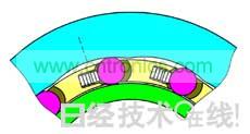 圖3:踩下離合器的狀態(tài)。向左旋轉保持器時,滾柱會向圓頂較低位置移動,進入由內輪與外輪相夾而成的楔形空間。
