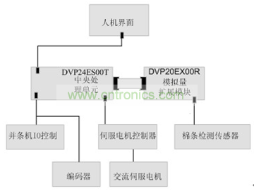 該控制系統(tǒng)的中央處理單元使用臺(tái)達(dá)DVP E系列的PLC,伺服控制系統(tǒng)使用臺(tái)達(dá)ASDA系列產(chǎn)品,人機(jī)界面使用選配DOP-B系列觸摸屏。工作時(shí),PLC通過DVP20EX00R模擬量控制模塊讀取棉條檢測(cè)傳感器的棉條厚度,對(duì)編碼器信號(hào)的處理計(jì)算出勻整1羅拉的速度,依據(jù)勻整控制關(guān)系式,就可計(jì)算出勻整2羅拉的轉(zhuǎn)速,再通過伺服控制器控制伺服電機(jī),以達(dá)到對(duì)勻整2羅拉的控制。