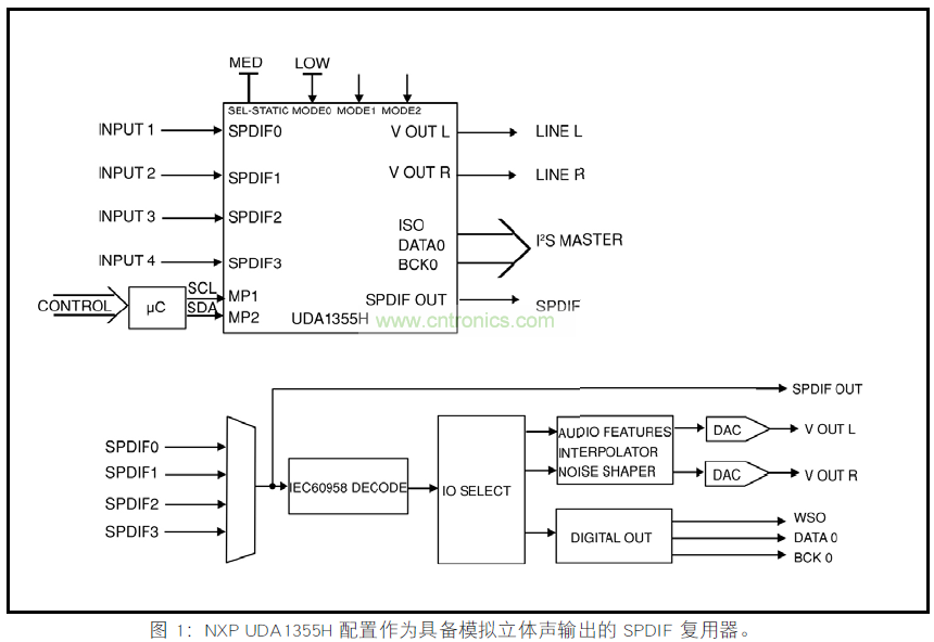 圖 1 顯示了配置為 1/4 SPDIF 的多路復用器,有模擬立體聲輸出的 NXP UDA1355H。請注意,復用器中選擇的SPDIF 信號也可以傳輸到 SPDIF 輸出,使組件可以使用菊花鏈,保持數字域音頻,維持音頻質量。因此,可以很容易地實現(xiàn) 1/(3n+1)多路復用器,其中第 n 個DAC,I2S 或 SPDIF 作為主復用輸出。如果這是所需要的全部,通過簡單將 SEL_STATIC引腳設置為高( 靜態(tài)模式),而不是中(I2C 模式),僅使用 UDA1355H無須微控制器就可以實現(xiàn)。