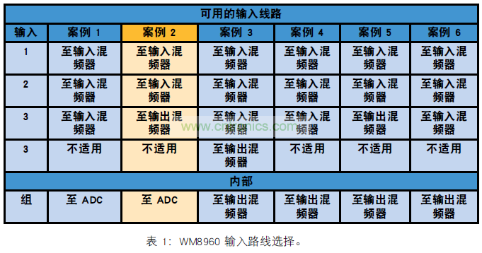 WM8960 提供了全面的內部路由選項,表 1 顯示了路由輸入有多么靈活。案例 2 描述了圖 4 所示的信號路徑路由。