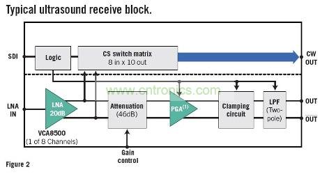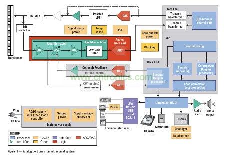 首先以超聲波設(shè)備為例來探討模擬性能需求。通過該范例,本文將介紹如何在性能、功耗、尺寸以及集成度之間進(jìn)行權(quán)衡,并檢測雙極性與CMOS工藝技術(shù)的適用性。圖1是典型超聲波機(jī)器的系統(tǒng)方框圖,展示了傳輸與接收兩個部分。這兩個部分負(fù)責(zé)驅(qū)動傳感器與數(shù)字處理部分(未顯示),從而構(gòu)成完整的超聲波設(shè)備。