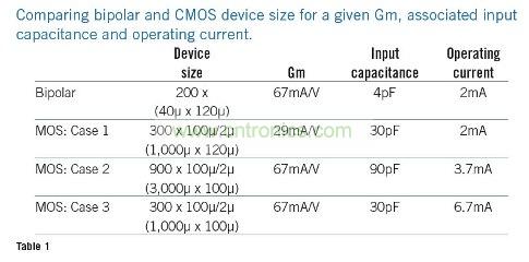 表1是用于放大器的雙極性器件和CMOS器件的尺寸比較。CMOS器件較大的尺寸及伴隨的輸入電容嚴(yán)重限制了放大器的輸入帶寬。在本例中,采用雙極性放大器可實現(xiàn)低偏置電流下的低噪聲。但使用雙極性器件可能會有基電流噪聲,而這在CMOS器件中則可以忽略不計。該基電流噪聲的幅度取決于傳感器的阻抗和系統(tǒng)具體的實施情況。