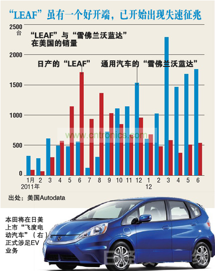 下圖為美國調(diào)查公司Autodata統(tǒng)計的、LEAF在美國市場的銷量走勢。該車于2010年12月上市,2011年銷勢良好,但進入2012年之后銷售速度減慢,截止6月份已連續(xù)三個月低于上年同月。與競爭車型——美國通用汽車(GM)的“雪佛蘭·沃藍達”在銷量上發(fā)生了逆轉(zhuǎn)。