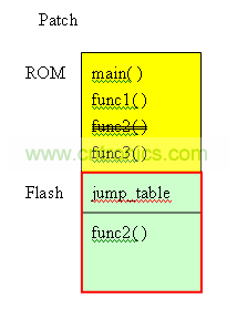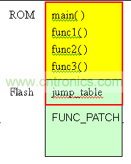 在上圖中,黃色區(qū)域是IC的ROM,這部份的程序是IC制作出來即不可以改變。綠色部份是flash。在圖中,flash分成2區(qū),一個(gè)是jump_table,存放func1~func3的地址。剩余的空間FUNC_PATCH,預(yù)留給patch使用。