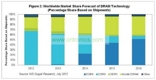 考慮到2011年出貨量為零,今年出貨量預(yù)計(jì)只占總體DRAM領(lǐng)域的1.4%,DDR4在2014年以前不會(huì)達(dá)到很大的規(guī)模。但DDR4市場兩年后將迅速增長,2014年市場份額將增至23.1%,超過目前占主導(dǎo)地位的DDR3。