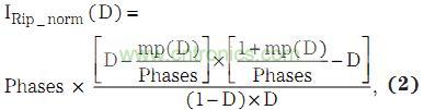 其中,D 為占空比,IRip_norm 為標(biāo)準(zhǔn)化的紋波電流,其為D 的函數(shù),而mp 為m 的整數(shù)。圖3 為這些方程式的曲線圖。例如,20% 占空比(D) 時(shí)使用2 個(gè)相,可降低25% 紋波電流。電容器必須承受的紋波電壓大小,可通過紋波電流乘以電容器的等效串聯(lián)電阻計(jì)算得到。很明顯,最大電流和電壓要求都降低了。