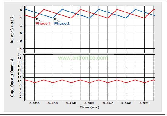 圖1 顯示了一款二相電路。由該電路的波形(圖2 所示)可以清楚地看到各相互相交錯(cuò)。這種交錯(cuò)可減少輸入和輸出紋波電流。另外,它還減少了印刷電路板或者某個(gè)特定組件上的熱點(diǎn)。實(shí)際上,二相降壓轉(zhuǎn)換器讓FET 和電感的RMS-電流功耗降低了一半。相交錯(cuò)還可以降低傳導(dǎo)損耗。