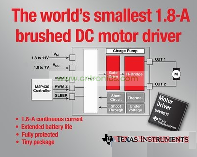 日前,德州儀器 (TI) 宣布推出業(yè)界最小型 1.8 A 有刷 DC 電機(jī)驅(qū)動(dòng)器,進(jìn)一步壯大其不斷發(fā)展的低電壓 DRV8x 電機(jī)驅(qū)動(dòng)器產(chǎn)品陣營。該 DRV8837 與最接近的同類競爭產(chǎn)品相比外形縮小 75%,可實(shí)現(xiàn)更小巧、更時(shí)尚、更具創(chuàng)新性的系統(tǒng)設(shè)計(jì)。此外,與現(xiàn)有器件相比,它還將 RDS(ON) 降低 50%,將睡眠電流降低 75%,從而延長電池使用壽命,提高電池供電或低電壓運(yùn)動(dòng)控制應(yīng)用的散熱性能。