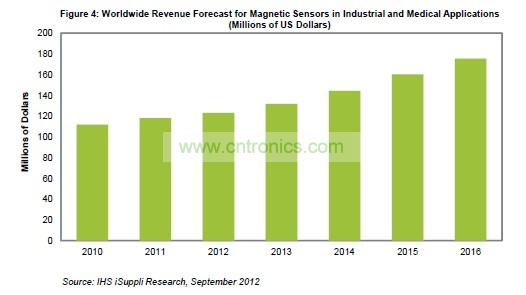 2011年工業(yè)與醫(yī)療磁性傳感器營(yíng)業(yè)收入為1.182億美元,而2010年是1.119億美元。盡管該領(lǐng)域的營(yíng)業(yè)收入少于汽車和無(wú)線-消費(fèi)等其它磁性傳感器領(lǐng)域,但將促進(jìn)未來(lái)幾年傳感器市場(chǎng)持續(xù)擴(kuò)張。到2016年,這個(gè)磁性傳感器領(lǐng)域的營(yíng)業(yè)收入將增至1.755億美元,如圖所示,五年復(fù)合年度增長(zhǎng)率為8%。
