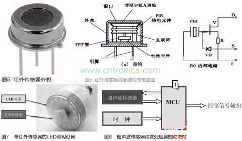 被動式紅外傳感器有三個關(guān)鍵性的元件:菲涅爾濾光透鏡,熱釋電紅外傳感器和匹配低噪放大器。菲涅爾透鏡有兩個作用:一是聚焦作用,即將熱釋紅外信號折射在PIR上:二是將探測區(qū)內(nèi)分為若干個明區(qū)和暗區(qū),使進入探測區(qū)的移動物體/人能以溫度變化的形式在PIR上產(chǎn)生變化的熱釋紅外信號。一般還會匹配低噪放大器,當(dāng)探測器上的環(huán)境溫度上升,尤其是接近人體正常體溫(37℃)時,傳感器的靈敏度下降,經(jīng)由它對增益進行補償,增加其靈敏度。輸出信號可用來驅(qū)動電子開關(guān),實現(xiàn)LED照明電路的開關(guān)控制。圖5是紅外傳感器外貌,圖6是紅外傳感器內(nèi)部結(jié)構(gòu)與內(nèi)部電路圖。圖7是帶紅外傳感器的LED照明燈具,這是一款E27標(biāo)準(zhǔn)螺口燈頭的燈具,其電源適用范圍是AC180V-250V(50/60Hz),紅外傳感器檢測范圍大約在3m~15m,其標(biāo)準(zhǔn)產(chǎn)品IFS-Bulb3W燈具達(dá)80lm,5W燈具達(dá)140lm.在LED光源模塊的中央部分嵌入紅外線傳感器。一旦紅外傳感器檢測到人的體溫,LED電燈泡將會在50s內(nèi)自動開啟與關(guān)閉。適用于任何一種室內(nèi)應(yīng)用,如走廊、儲藏室、樓梯和大廳入口處。