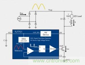 FL7701集成有功率因數(shù)校正(PFC)??梢詮氖褂眯⌒吞沾删S持電容的整流離線輸入來供電。這樣就可省去輸入端的電解電容,也不需要用于IC的自偏置電源軌。