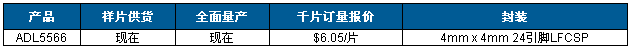 ADL5566采用ADI公司的高速SiGe工藝制造,提供緊湊型4 mm × 4 mm、24引腳LFCSP封裝,工作溫度范圍為−40°C至+85°C。