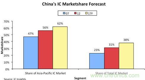 IC Insights表示,中國IC市場規(guī)模將由2014年的1000億美元,在2017年成長至1500億美元;該機(jī)構(gòu)估計(jì),在2017年,中國市場將占據(jù)全球晶片市場38%的比例。而在2007年,中國晶片市場營收占據(jù)全球晶片市場營收的比例為23%。