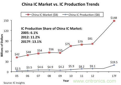 市場研究機(jī)構(gòu)IC Insights的最新預(yù)測報(bào)告指出,中國IC市場可望在2012~2017年之間,以13%的復(fù)合年平均成長率(CARG)持續(xù)擴(kuò)張,報(bào)告同時(shí)指出,中國IC市場持續(xù)擴(kuò)張的背后,主要依靠來自外國制造商在中國地區(qū)的大規(guī)模投資建廠。