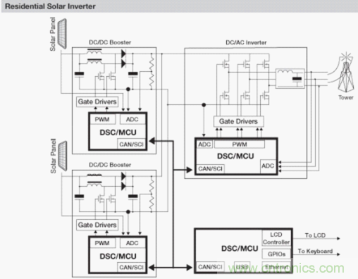 家庭太陽(yáng)能逆變系統(tǒng)中,飛思卡爾的處理器、微控制器產(chǎn)品,如MC56F84XXX、MC56F82XX、56F803X等等產(chǎn)品,為整個(gè)系統(tǒng)帶來可行、高效、可靠的電源轉(zhuǎn)換方案。