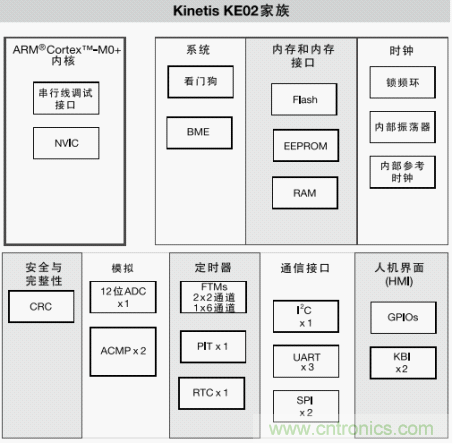 以Kinetis子系列KE02 MCU為例來看。KE02 MCU以ARM Cortex-M0+為內(nèi)核,該內(nèi)核以其低功耗特性深獲市場(chǎng)贊譽(yù)。KE02也是Kinetis E系列的入門級(jí)產(chǎn)品,引腳與整個(gè)E系列兼容,擴(kuò)展靈活,另外,它們還與8位S08P系列兼容。