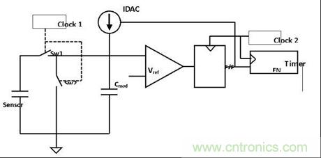 通過在GND和VREF(內(nèi)部生成)之間切換傳感器,只要在器件規(guī)定的工作范圍內(nèi),電源的任何變化都不會造成假觸發(fā)。圖2顯示了傳感器電容在集成電容(Cmod)電壓和GND之間用兩個(gè)非重疊時(shí)鐘Sw1和Sw2切換時(shí)的技術(shù)實(shí)施情況。電路比較器的輸出通過觸發(fā)器作為定時(shí)器的使能信號,并通過調(diào)節(jié)電源來確保Cmod電壓與參考電壓(Vref)相同。由于輸入端上的任何信號都就n個(gè)時(shí)鐘周期求積分(n取決于分辨率),因此耦合到輸入端上的任何高頻噪聲都會通過積分效果被平均。