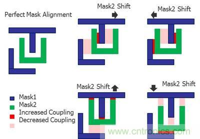 圖2:雙重成像(DP)的光罩可能存在的未對準情況要求設(shè)計人員評估更多寄生參數(shù)提取的corners,以驗證集成電路的時間選擇和性能。