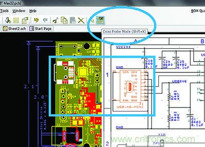 6.0版本中的交叉探測(cè)(X-probe)功能能夠在軟件內(nèi)實(shí)現(xiàn)原理圖與PCB設(shè)計(jì)視圖之間的即時(shí)引用,從而進(jìn)一步加快設(shè)計(jì)過(guò)程。通常情況下在PCB視圖中元件的識(shí)別是比較直觀、容易的,但在原理圖中找到該元件的對(duì)應(yīng)符號(hào)卻不那么容易,除非用戶對(duì)整個(gè)系統(tǒng)都了如指掌。通過(guò)交叉探測(cè)功能,用戶只需在任一視圖中點(diǎn)擊某個(gè)元件,即可迅速跳轉(zhuǎn)到對(duì)應(yīng)視圖中的同一元件。該功能可從PCB視圖跳轉(zhuǎn)到原理圖,反之亦然。