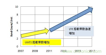 3G技術(shù)只是一種上行和下行達(dá)到數(shù)Mbps程度的速度,但是LTE卻以上行50Mbps以上,下行100Mbps以上的速度,達(dá)到了與固定通信網(wǎng)絡(luò)速度相同的目標(biāo)。GSM/UMTS對應(yīng)終端中,通常都是GSM搭載4個(gè),UMTS搭載2-4個(gè)頻帶,如果要對應(yīng)LTE的話還會再追加1-2個(gè)頻帶。圖1是移動(dòng)設(shè)備中搭載的平均頻帶數(shù)的推測圖。網(wǎng)絡(luò)上的通信量增大的同時(shí),保證了通信容量、通信頻率,LTE頻帶的搭載數(shù)量預(yù)測也將迅速增加。