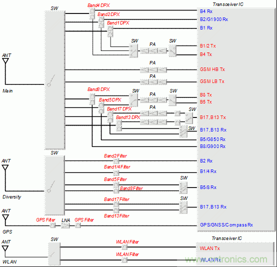 圖2:GSM/UMTS/LTE對應(yīng)終端的前端配置的示例