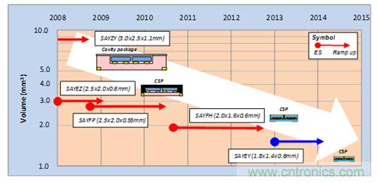 圖4所示是村田SAW雙工器產(chǎn)品尺寸的變遷。從舊的空腔3025尺寸(3.0×2.5mm),到后來通過確立樹脂封止方法將CSP型號成功產(chǎn)品化,實(shí)現(xiàn)了小型化。再后來,通過改善電極設(shè)計(jì)和加工技術(shù),繼續(xù)完善對小型化的完善。于是,2013年成功地將1814尺寸 (1.8×1.4mm)的CSP型號SAW雙工器產(chǎn)品化。它比現(xiàn)在主流的2016尺寸(2.0×1.6mm)還要再減少20%的搭載面積,成為了支撐今后搭載頻帶數(shù)量增加的新技術(shù)。