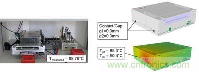 底盤的一部分被用作汽車功放的冷卻散熱片。底盤的一個重要方面在于頂部支架和底蓋的熱接觸程度(關(guān)乎制造公差)。對模型假設(shè)進(jìn)行驗證是提高模型精確度的關(guān)鍵。這樣可以測量產(chǎn)品原型并利用測量結(jié)果來比較模擬模型。方案1 (g1) 無間隙(完全熱接觸),而方案2(g2) 則存在0.3毫米的間隙,因此蓋子之間沒有熱接觸。通過比較所測量的