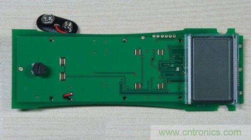 翻轉(zhuǎn)板卡,另一面的電路就更少了,除了一個段式的LCD模塊,以及幾個功能按鍵(黑色旋鈕為校準(zhǔn)溫度的變阻器),就沒什么東西了,有意思的是段式LCD模塊與PCB板的連接方式。