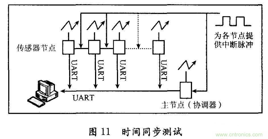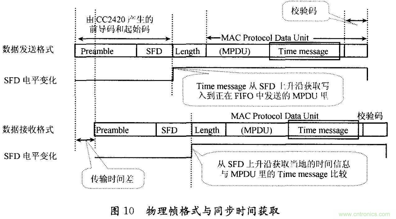 時(shí)間同步協(xié)議軟件的測(cè)試連接圖如圖11所示。主控節(jié)點(diǎn)和傳感器節(jié)點(diǎn)被連接到一 個(gè)公共的有線信號(hào)上,這個(gè)信號(hào)又連接到MSP430的帶計(jì)時(shí)器捕獲周期性地發(fā)送一個(gè)包含時(shí)間信息的信標(biāo)幀給從節(jié)點(diǎn)來(lái)維持網(wǎng)絡(luò)同步通信。在協(xié)議軟件實(shí)現(xiàn)時(shí), 需要對(duì)FTSP進(jìn)行簡(jiǎn)化,采用ZigBee星型網(wǎng)絡(luò)拓?fù)浣Y(jié)構(gòu)對(duì)時(shí)間同步所需的計(jì)算資源進(jìn)行最小化處理。Zig-Bee消息的時(shí)間固定點(diǎn)選擇為幀起始限定符 (SFD)。參考圖3中的CC2420射頻收發(fā)器與微控制器接口對(duì)應(yīng)管腳的高低電平,圖1O顯示了IEEE802.15.4物理幀格式l和時(shí)間信息獲取過(guò) 程。主節(jié)點(diǎn)無(wú)線收發(fā)器發(fā)送一個(gè)信號(hào)給控制器,指示SFD字節(jié)已被接收或發(fā)送。一旦SFD字節(jié)被發(fā)送,無(wú)線收發(fā)器驅(qū)動(dòng)SFD管腳,向微處理器提出中斷要求, 并啟動(dòng)時(shí)間捕獲。這樣,微處理器在SFD字節(jié)被發(fā)送后可立即獲得一個(gè)時(shí)間點(diǎn),并將該時(shí)間插入到當(dāng)前的時(shí)間同步消息中去。同樣,當(dāng)接收器接收到SFD,也隨 即產(chǎn)生一個(gè)本地時(shí)間信息,并把它和時(shí)間同步消息一起存儲(chǔ)。微控制器通過(guò)比較兩個(gè)時(shí)間信息,可以確定本地時(shí)間和全網(wǎng)時(shí)間的偏移量,并調(diào)整本地時(shí)鐘與主節(jié)點(diǎn) (協(xié)調(diào)器)全局時(shí)鐘保持一致。